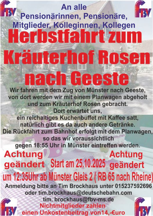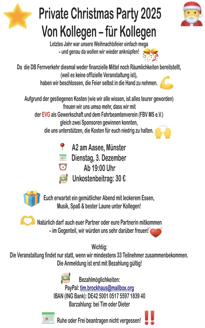 auf der Generalversammlung des Fahrbeamten Vereins Münster am 29. November 2024 haben wir einen wichtigen Beschluss gefasst. Aufgrund der allgemein gestiegenen Kosten, die auch unseren Verein betreffen, wurde entschieden, den jährlichen Mitgliedsbeitrag von bisher